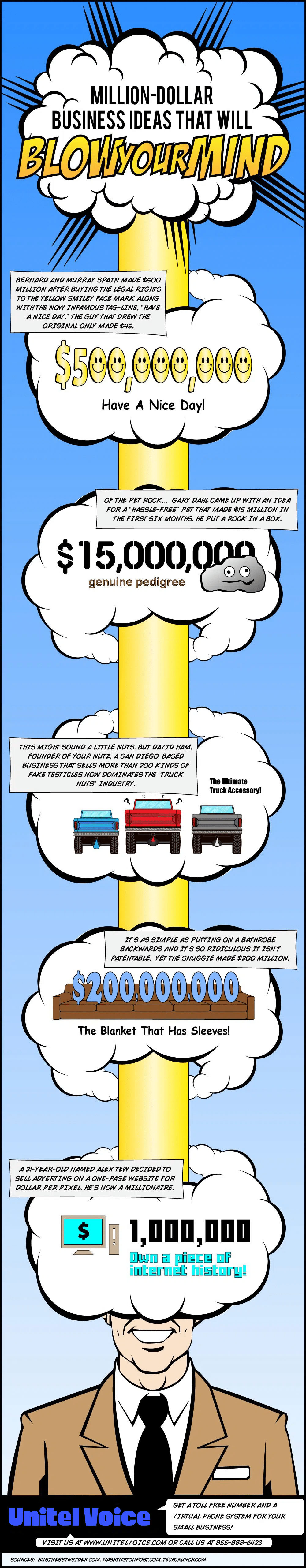 This infographic by the marketing team at Unitel Voice highlights five quirky startup ideas that transformed into multimillion-dollar ventures. From the simple smiley face design and the fad of pet rocks, to novelty truck accessories, the infamous Snuggie, and even a website selling pixels, the graphic shows how unusual concepts captured mass attention.