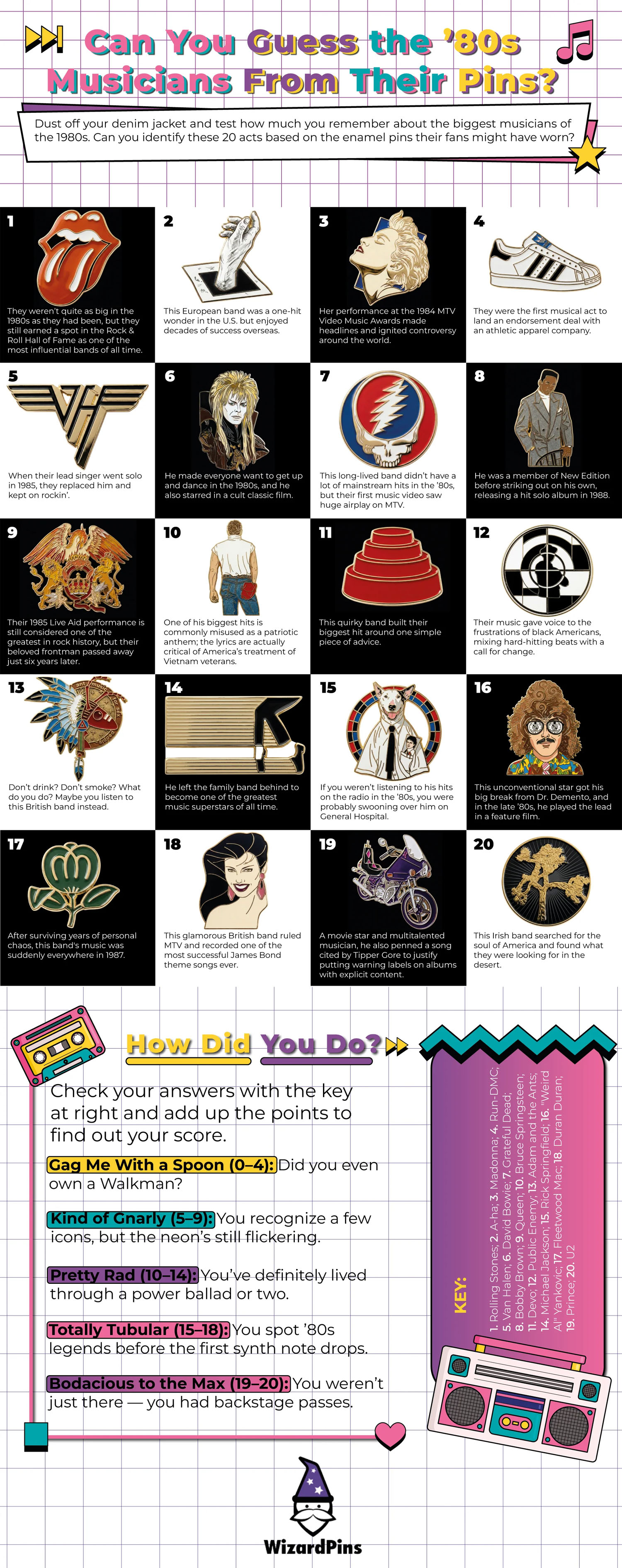 The WizardPins team has captured this spirit with a curated collection of design concepts inspired by some of the decade’s most memorable acts. From synth-pop hits to arena rock anthems, each design reflects the essence of the 1980s in miniature form. But how well do you really remember the iconic musical artists of the ’80s?