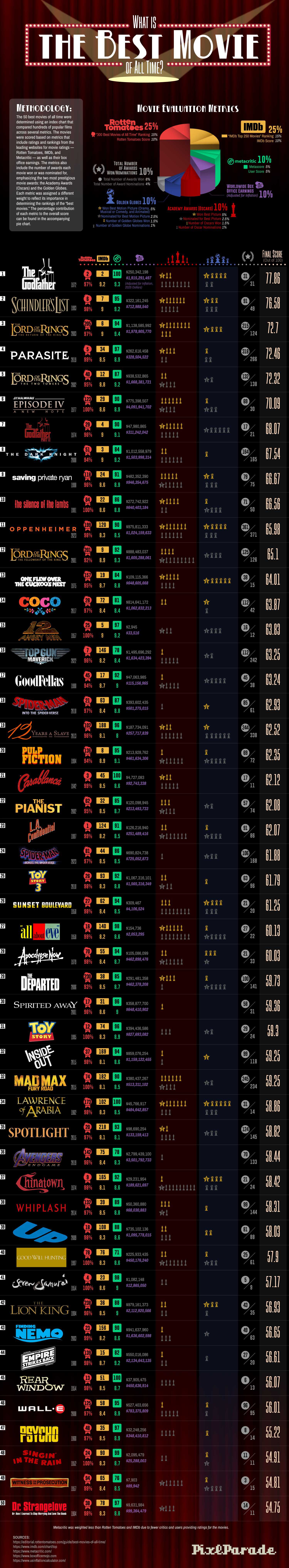The team at PixlParade aimed to create a scoring system for movies that would reflect the qualities that make a film great. They used data from trusted rating sites like Metacritic, IMDb, and Rotten Tomatoes, combined with awards the film won, and box office success, to determine which films have received the most accolades and made the biggest impact.