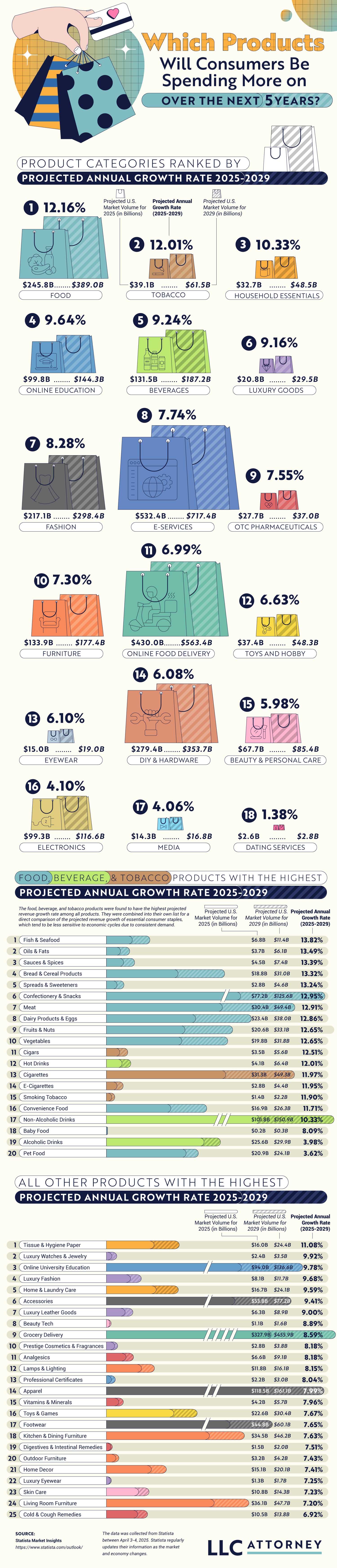 Companies strive to predict future sales, and while it’s no easy task, there are plenty of indicators to help predict which industries will grow. The team at LLC Attorney used this data to help determine which products consumers are willing to spend the most on in the next five years.